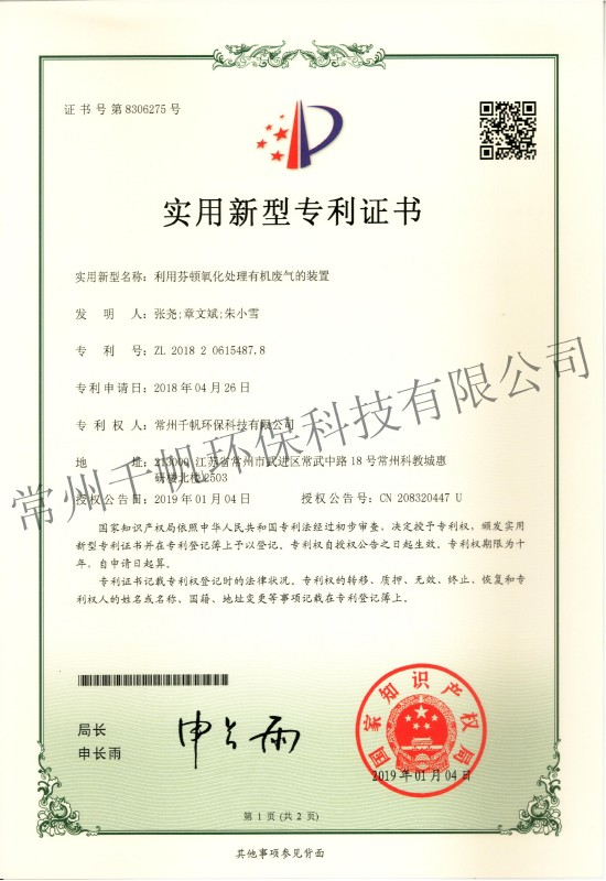 實用新型專利證書 一種用于處理含塵有機廢氣的一體化裝置